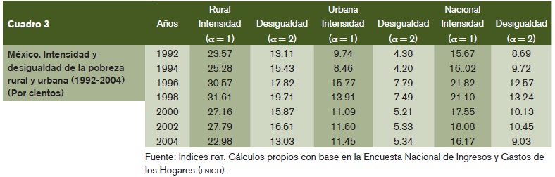 Resulta claro, además, que la incidencia de la pobreza no ha sido uniforme a lo largo del tiempo, toda vez que se observa con claridad el significativo incremento que habría registrado a consecuencia de la profundización de la crisis económica de 1995 y de sus secuelas en 1996. Un fenómeno similar -aunque de menor intensidad- se registró como resultado de la recesión de 2002 (Gráfica 1). Los efectos del ciclo económico se habrían observado también en la "intensidad" y en la "desigualdad" de la pobreza, que además son más agudas en las zonas rurales que en las urbanas del país (Cuadro 3).10