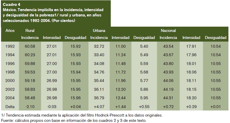 Tendencias diferentes surgen, sin embargo, cuando se desagrega la información entre zonas rurales y urbanas. En las rurales la tendencia de HP de la incidencia de la pobreza sugiere una disminución de mediano plazo mayor de dos puntos porcentuales, cambio que podría ser significativamente diferente de cero en términos estadísticos; ese proceso se habría acompañado de una relativa constancia en la intensidad y en la desigualdad de la pobreza en las mencionadas zonas rurales. Por el contrario, el fenómeno habría registrado tendencias opuestas en las zonas urbanas del país, ya que la tendencia hp de la incidencia de la pobreza acusa un incremento de más de cuatro puntos porcentuales a lo largo del período, y tendencias crecientes se habrían registrado también en términos de la intensidad y la desigualdad de la pobreza en las zonas urbanas (Cuadro 4). Por su magnitud, estos incrementos difícilmente podrían ser estadísticamente iguales a cero.