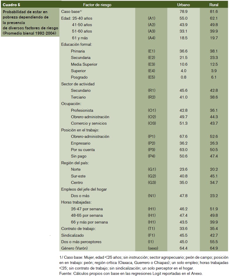 La cuantificación de tales probabilidades se logra mediante el cálculo de regresiones logísticas aplicadas a los micro-datos bienales de la ENIGH. Los cálculos se realizan de manera separada para las áreas urbanas y rurales. Los factores de riesgo se relacionan con diversas características sociodemográficas de los jefes de hogar: su edad, su educación formal, el sector de actividad en que laboran, la ocupación y la posición en el trabajo que desempeñan, la región geográfica en donde residen, el número de empleos del jefe del hogar, las horas trabajadas por semana, la existencia (o no) de contrato formal de trabajo, su afiliación sindical y el número de perceptores del hogar.16