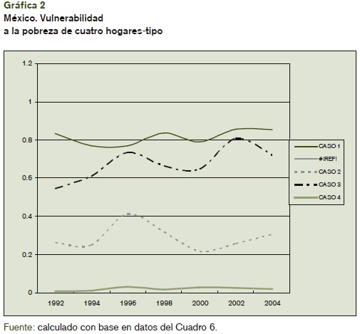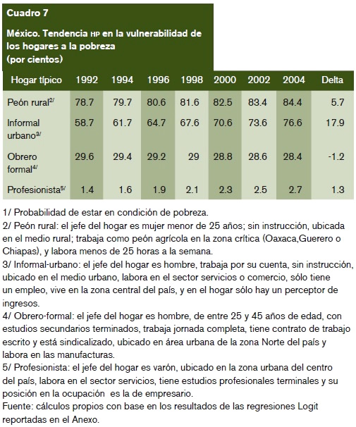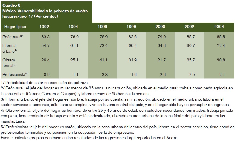 Los análisis anteriores ponen de manifiesto, en suma, no sólo que las limitaciones del bienestar afectan a núcleos muy importantes de la población mexicana, sino además que los hogares nacionales enfrentan, de manera crónica, una elevada vulnerabilidad a la pobreza, esto es, se encuentran inmersos en situaciones permanentes de incertidumbre y riesgo de continuar indefinidamente en condiciones de limitado bienestar económico. Esa vulnerabilidad no sólo se ve afectada por la coyuntura de la economía, sino que ha tendido a acrecentarse de manera gradual en el mediano plazo, especialmente para los núcleos de trabajadores no calificados cuya inserción en el mercado laboral es de carácter informal y precaria.