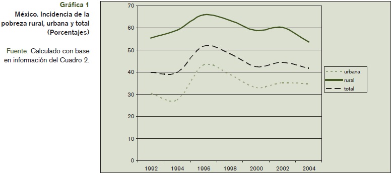 Hemos visto que una proporción considerable de la población nacional no tiene acceso, con su ingreso corriente, a la adquisición de bienes y servicios básicos que le permitan alcanzar niveles mínimos adecuados de bienestar económico, limitando con ello sus capacidades para funcionar en sociedad. Y aunque ese núcleo de la población se vio muy afectado por las persistentes condiciones recesivas de la economía, las tendencias de mediano plazo apuntan a una paulatina -si bien gradual- disminución de la incidencia de la pobreza sólo en el ámbito rural, ya que en las zonas urbanas del país presenciamos su acrecentamiento.
