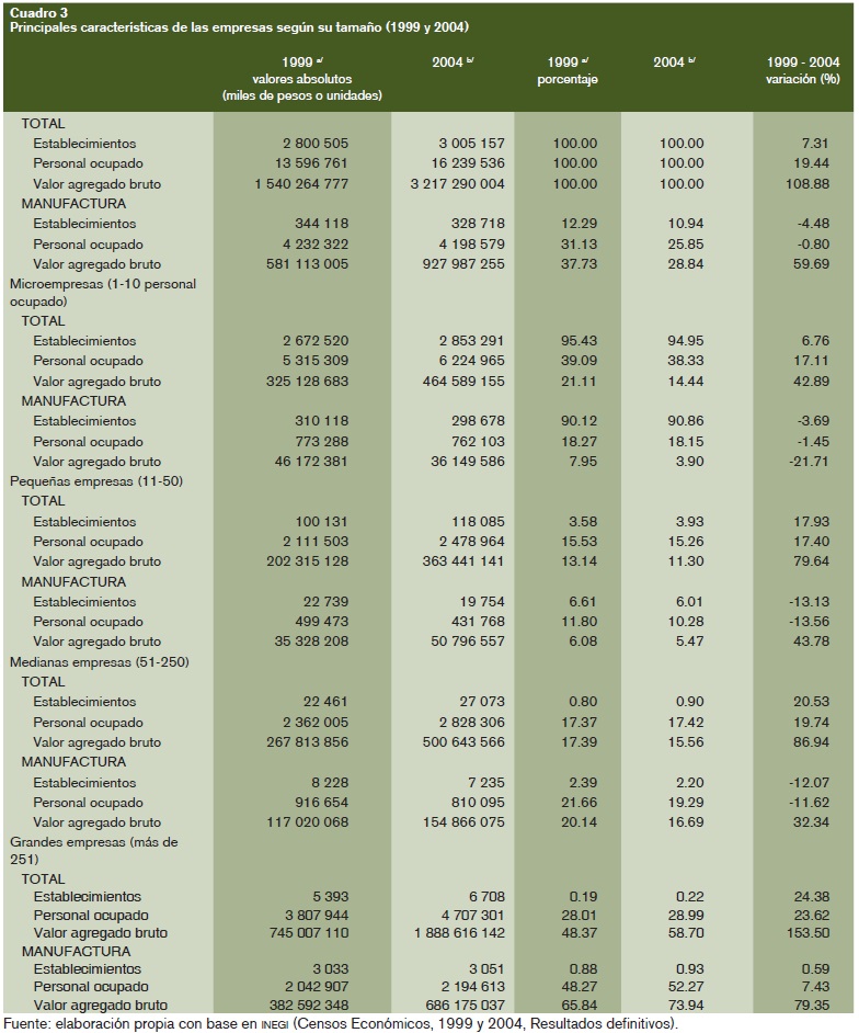A nivel del tamaño de las empresas, el cuadro 3 refleja que el sector manufacturero se ha rezagado con respecto al resto de la economía durante 1999-2004; destaca particularmente la pérdida absoluta de empleo y establecimientos. Sin el objetivo de abarcar la riqueza de este debate y del cuadro, sobresalen tres tendencias adicionales: