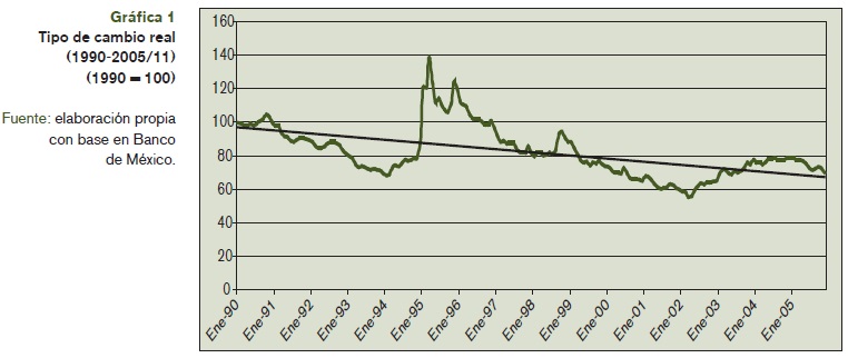 El tipo de cambio real ha tendido significativamente a sobrevaluarse desde los ochenta y hasta 2005: según la información presentada por el Banco de México (véase el cuadro 1) a noviembre de 2005 el peso se encontraba sobrevaluado en más de 30%; desde la década de los noventa se perfila claramente una tendencia a sobrevaluarse, y como resultado del tipo de cambio como ancla antiinflacionaria; la gran excepción es sin lugar a dudas la crisis de 1994/1995 y la abrupta devaluación en la que incurrió el período. Desde esta perspectiva, la tendencia a sobrevaluar el tipo de cambio real se ha convertido en la actualidad en uno de los principales -si no es que el principal- desincentivo para el aparato productivo nacional, haciendo más competitivas en precios a las importaciones y afectando a las exportaciones con objeto de controlar el nivel de precios.6