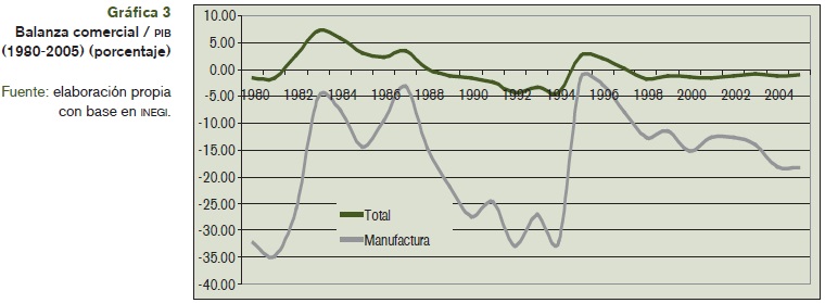 El aparato productivo en México, particularmente el manufacturero, ha tenido profundas dificultades para insertarse en el mercado internacional y para mantener su posición en el mercado interno. La gráfica 3 refleja sólo las dificultades de la manufactura para incrementar su valor agregado desde el proceso de apertura a finales de la década de los ochenta, así como una de las principales paradojas de la industrialización orientada hacia las exportaciones: para incrementar su PIB, la manufactura requiere de cada vez mayores incrementos de insumos importados; su magnitud afecta sustancialmente la balanza comercial, de cuenta corriente y la macroeconomía en su conjunto. Desde esta perspectiva, diversos estudios (Dussel Peters, 2005; Monitor de la manufactura mexicana; Moreno-Brid et. al., 2005) señalan importantes rupturas de cadenas de valor desde los noventa y una enorme dificultad para endogeneizar procesos por parte del sector manufacturero e industrial.