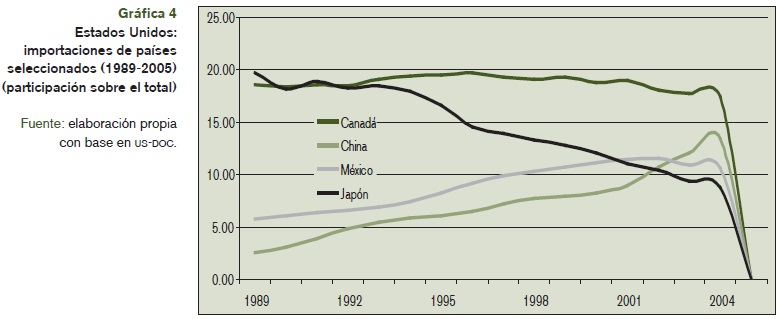 Tanto para China como para México, el mercado estadounidense se ha convertido en el de mayor dinamismo desde la década de los noventa. Si bien hasta 2000 ambas naciones incrementaron constantemente su participación en las importaciones de Estados Unidos, desde entonces esta tendencia se revierte para México ante la creciente participación de las exportaciones chinas: en 2002 México fue desplazado por China como el segundo principal exportador a Estados Unidos, y en 2005 China y México representaron 14.62 y 10.17% de las importaciones estadounidenses, respectivamente. La participación mexicana ha caído constantemente desde entonces, mientras que la china se incrementó en promedio 49.7% durante 2002-2005. Diversos estudios puntuales demuestran, asimismo, que las dificultades de las exportaciones mexicanas se deben a un importante desplazamiento en sectores específicos -particularmente electrónica, textiles y confección- por productos chinos en el mercado estadounidense. Con excepción, por el momento, del sector automotriz, las exportaciones mexicanas y particularmente aquellas bajo los procesos de importaciones temporales para su exportación, se han visto directamente afectadas en el mercado estadounidense por la competencia asiática y sobre todo la proveniente de China (véase la gráfica 4).