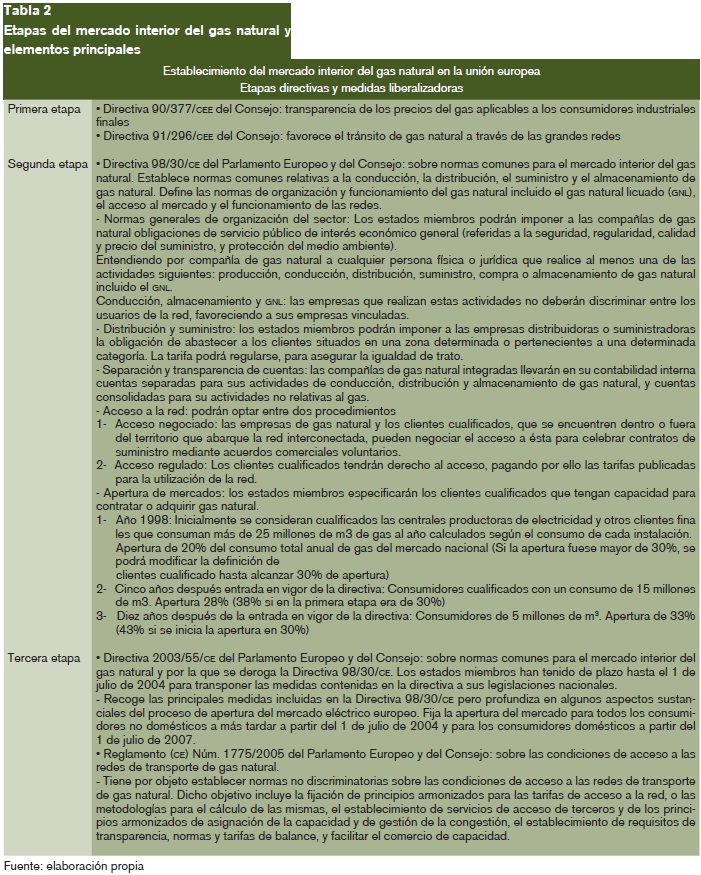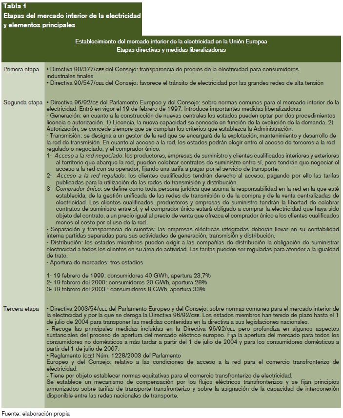 En 1992 la Comisión formalizó el marco regulador para la creación del mercado interior de la electricidad estableciendo un calendario que se desarrollaba en tres etapas con las que se completaría la incorporación de mecanismos de competencia a las actividades eléctricas (Comisión Europea; 1991). De forma paralela se configuró el mercado del gas natural siguiendo el mismo esquema de introducción de competencia.