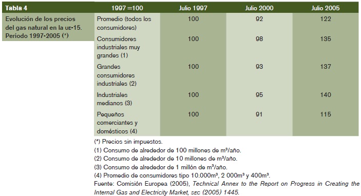En consecuencia, dado el escenario alcista de precios del gas natural en los mercados internacionales durante el período analizado, se puede afirmar que en el conjunto de la Unión Europea la subida de precios que se experimenta en los últimos cinco años ha sido relativamente moderada, ya que incluso en el mayor de los casos (industriales medianos) el incremento de los precios no ha superado 50%. Además, si se analiza el periodo en su totalidad, los descensos de precios en los años 1997-2000 han amortiguado las subidas de precios que se han generalizado en el siguiente período 2000-2005. Tomando como referencia el año 1997, el mayor incremento de precios se ha producido en los industriales medianos con 40%, que comparado con el alza de los precios internacionales del gas resulta moderado.