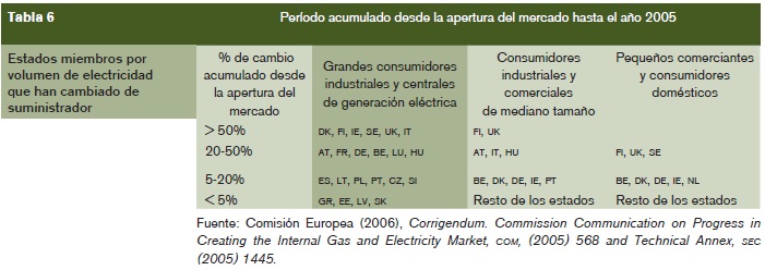 En definitiva, desde que se inició la apertura de los mercados eléctricos y gasísticos en la Unión Europea en el año 1997 y 1998, respectivamente, se han producido importantes avances en el conjunto de la Unión, y actualmente la mayoría de los Estados de la ue-15 ya disponen de mercados totalmente abiertos a la competencia donde sus consumidores, con independencia del nivel de consumo, pueden elegir libremente suministrador. Sin embargo, la incorporación en el año 2004 de diez nuevos estados miembros ha creado una "Europa energética" de dos velocidades, dado que los nuevos países, a pesar de los importantes esfuerzos que han hecho en estos últimos años por adaptarse a la normativa europea y por acelerar el proceso de liberalización, desregulación y privatización de sus sectores energéticos, en la mayoría de los casos aún están lejos de alcanzar los niveles de competencia y apertura de los mercados que presentan los estados de la UE-15.