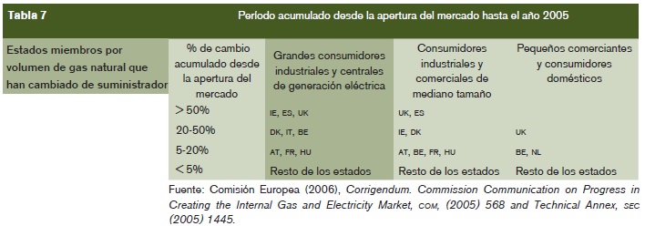 Por último, en relación con el cambio de suministrador, se debe mencionar que tanto para el caso del gas como para la electricidad, los nuevos estados miembros presentan un porcentaje de cambio de suministrador muy reducido que no supera en general 5% del volumen de consumo, salvo algunas excepciones como el caso de Hungría, que para los grandes y medianos consumidores industriales alcanza porcentajes de 32% en electricidad y de 6% en el gas.
