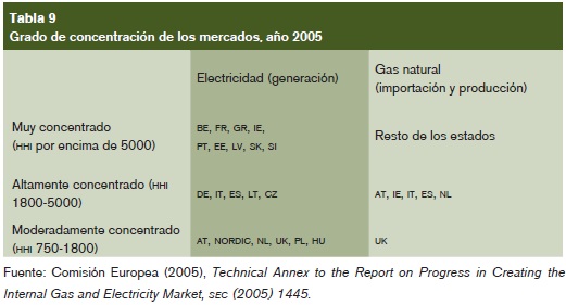 Atendiendo al índice de concentración HHI, calculado como la suma del cuadrado de las cuotas de los distintos agentes del mercado considerado, se puede afirmar que los mercados de gas y electricidad en la Unión Europea están muy concentrados. En el caso eléctrico, casi todos los países tienen mercados eléctricos de generación concentrados o muy concentrados, sólo Austria, los países nórdicos, Holanda, Reino Unido, Polonia y Hungría, tienen mercados moderadamente concentrados. En el caso del gas, excepto el Reino Unido, el resto de los países tienen mercados de producción/importación de gas muy concentrados, cuyos índices de concentración superan en casi todos los casos 5000.