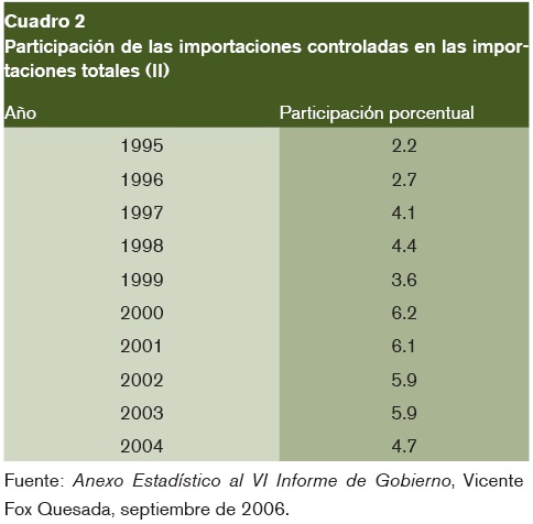 En otros términos, el Ejecutivo no puede utilizar el control directo cuando las condiciones generales de la economía sean, por el motivo que fueren, particularmente adversas ni cuando un sector productivo esté en riesgo como consecuencia de un aumento desproporcionado de las compras en el exterior. La eliminación de estas dos causales para el establecimiento del permiso previo refleja el propósito de utilizar este instrumento sólo de forma marginal. Entre 1995 y 2004 el permiso previo cubrió entre 2.2 y 6.2% de las importaciones totales: