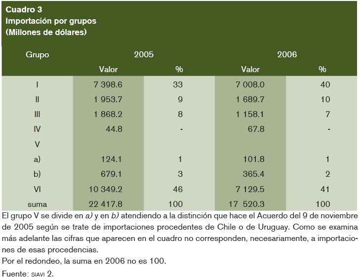 Los grupos tercero y quinto contienen fracciones controladas para las importaciones originarias de seis países de la ALADI y Panamá, el tercero, y de Chile y Uruguay, el quinto. La estadística registra que entre ambos absorben 4 y 3%, en 2005 y en 2006, de las importaciones sometidas a permiso previo, pero no se trata de compras en esos países, lo que pone de manifiesto el propósito de proteccionismo discriminatorio de este control. En 2005 se importó leche en polvo con un porcentaje de grasa menor a 1.5 por un monto de 333 millones de dólares (112 millones a agosto de 2006), de los que sólo 7.5 millones provinieron de Argentina y 3.3 millones de Uruguay (las cifras para 2006 son: 3.6 millones de Argentina, 400 mil dólares de Brasil y nada de Uruguay). Las importaciones de leche en polvo con un contenido graso superior a 1.5% en 2005 ascendieron a 98 millones de dólares, de los que 18 millones vinieron de Argentina y 100 mil dólares de Chile (en 2006, a agosto, se importaron 75 millones de dólares, de los que 13 procedieron de Argentina y nada de los demás latinoamericanos).
