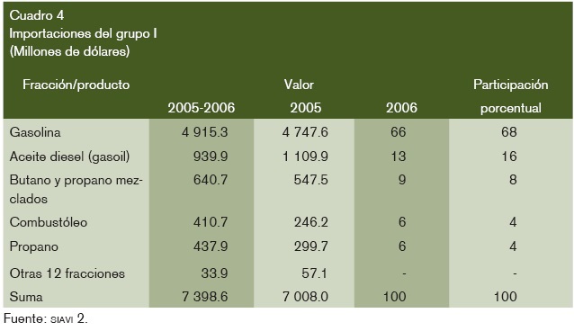 Los datos agregados pueden conducir a conclusiones equívocas. En el caso del primer grupo, las importaciones se limitan a cinco fracciones: la gasolina, el diesel, el butano y el propano mezclados entre sí, el combustóleo y el propano. Algunas de las otras fracciones controladas en este grupo ampararon importaciones irrelevantes; dos ejemplos significativos: las importaciones vinculadas con los programas de mejoramiento ambiental administrados por la Secretaría del Medio Ambiente ascendieron en 2005 a 8.4 millones de dólares y a 19.2 hasta agosto de 2006, y las importaciones cubiertas por programas de investigación y desarrollo tecnológico en el marco del Conacyt sumaron 9 y 4 millones de dólares, respectivamente.