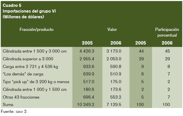 El segundo grupo en importancia en cuanto al valor de las importaciones controladas es el de los vehículos usados (el sexto en la clasificación tomada del Acuerdo del 9 de noviembre de 2005). Son, como en el grupo anterior, unas cuantas fracciones (media docena) las que concentran más de 90% del valor importado y se refieren a vehículos tipo turismo para el transporte de pasajeros y de vehículos para el transporte de mercancías y, como ya se dijo, no hay forma de conocer si todo se trata de equipo usado.