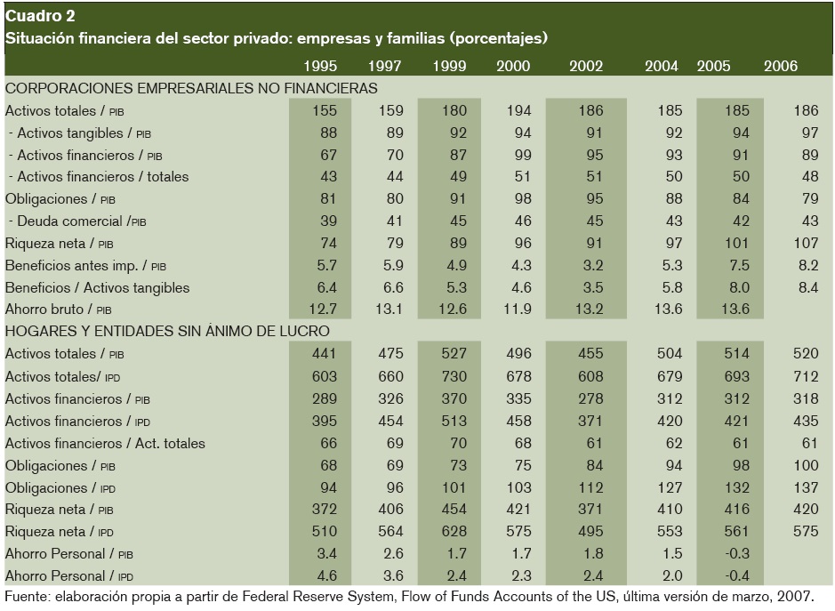 En consecuencia, desde el punto de vista de los cinco mecanismos de sobre-reacción que actuaron en la expansión de los años noventa, dos de ellos han seguido acentuándose (el endeudamiento de los hogares y el financiamiento exterior), otro permanece en tono más moderado (la apreciación de la moneda), otro ha mutado (la burbuja bursátil en burbuja inmobiliaria) y otro desaparecido (la sobre-inversión empresarial).