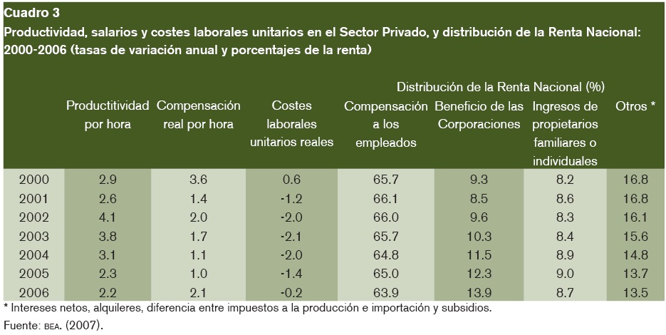 En efecto, frente a los mencionados incrementos de la productividad, la compensación real por hora percibida por los empleados ha registrado aumentos acumulados de 5.2 y 4.2% en cada trienio (cuadro 5). Por tanto, en términos reales, los costes laborales unitarios han descendido, sucesivamente, 5.3 y 3.6%, esto es a una tasa media de -1.5% anual. No sólo los ingresos salariales han crecido con lentitud, sino que muchas empresas se han desprendido de los compromisos contraídos con sus empleados para cubrir la parte correspondiente a las pólizas de seguros médicos. En ese contexto tan favorable, en apenas cinco años los beneficios del sector corporativo han incrementado cinco puntos y medio su participación en la Renta Nacional (hasta 13.9%) y que la cuota de la compensación a los empleados haya perdido más de dos puntos (cuadro 3).