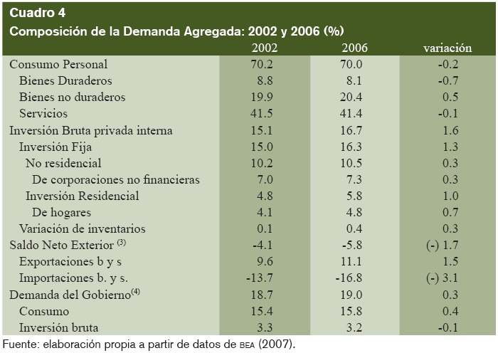 La economía atravesó su peor momento durante el bienio 2001-2002, cuando la tasa de crecimiento del PIB fue, sucesivamente, de 0.8 y 1.6% y la inversión privada fija no residencial se situó en tasas negativas de -4.2 y -9.2%. En esos años el débil ritmo de la actividad económica estuvo sostenido por el consumo privado (en particular, los bienes duraderos), la demanda del gobierno federal (gasto militar) y las importaciones. Seguidamente, el crecimiento del PIB volvió a registrar tasas más altas, alcanzando una media de 3.2% en el cuatrienio 2003-2006, recreándose entonces varios de los mecanismos sobre-reactivos que habían operado en los años noventa.