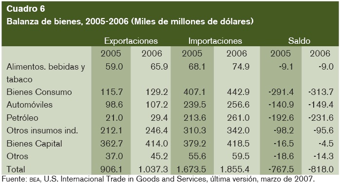 Salvo en los años recesivos en los que las exportaciones disminuyeron, su recuperación posterior indica que el desequilibrio comercial no proviene del lado de la venta de bienes en los mercados internacionales, sino que obedece al descomunal incremento de las importaciones, cuyo valor se acerca ya a los dos billones de dólares y equivale al 14% del PIB. Esto significa que para que la producción haya crecido un 13.5% durante el cuatrienio 2003-2006 las importaciones lo han hecho en 28 por ciento.