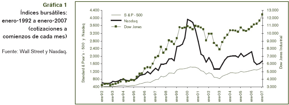 Por el lado de las cotizaciones bursátiles, el retroceso tocó fondo en el primer trimestre de 2003, volviendo a una tónica alcista que se ha consolidado más en 2006, probablemente con el desplazamiento de capitales provenientes del sector inmobiliario. Con incrementos cercanos a 9%, el índice Dow Jones recuperó su nivel de 11 000 puntos alcanzado en 1999 y después superó los 12 000 puntos (gráfica 1). Por su parte, Standard & Poor's se acercaba a su máximo precedente, superando el nivel de 1 400 y Nasdaq, más titubeante, llegaba a los 2 300, bajando después a 1 700, pero siempre lejos de aquellos 3 900 convertidos en símbolo de la burbuja finisecular.