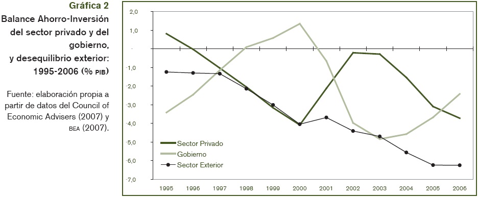 La modificación de algunas premisas conllevaría la quiebra de ese circuito y, por tanto, la imposibilidad de mantener la dinámica de crecimiento de la demanda interna. Esas premisas son exógenas a la economía estadounidense ya que dependen de hechos tales como el mantenimiento del fuerte ritmo de crecimiento de los países asiáticos, la continuidad de su preferencia por mantener sus reservas en dólares y su disposición a seguir invirtiendo en los mercados financieros estadounidenses (Blanchard, et al., 2005; Gourichas y Rey, 2005; Gros, 2006; McKinley, 2006).