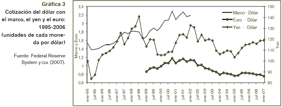 En esas condiciones, los hogares y las empresas estadounidenses se beneficiaban de la importación de bienes cada vez más baratos, adquiridos cada vez en mayor medida con el financiamiento aportado por esos inversores extranjeros. Se estrechaba así la interacción entre el endeudamiento privado, el déficit comercial y los dos mecanismos sobre-reactivos externos. El proceso apreciativo se mantuvo hasta enero de 2002, cuando en presencia de las mencionadas dificultades para captar capital internacional en el volumen requerido y en pleno contexto recesivo, el dólar comenzó a perder una parte del valor que había incrementado en los años anteriores frente al euro, el yen y otras divisas.