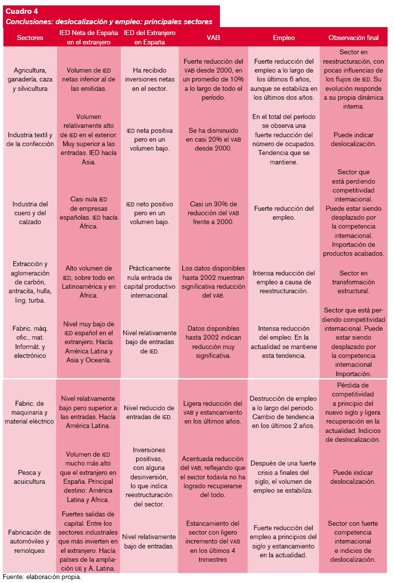 El análisis de los flujos de IED, de la desinversión, del VAB y de la evolución del número de ocupados en las distintas ramas de actividad de la economía española han permitido concluir que existen ocho sectores que pueden estar enfrentando un proceso de deslocalización industrial, puesto que es en ellos donde se ha observado una reducción constante y sostenida del número de ocupados y una reducción de la producción. A partir de esta información se ha evaluado cada uno de estos sectores a partir de los flujos de entrada y salida de IED, puesto que la hipótesis de partida de este trabajo identificaba posibles sectores afectados por deslocalización industrial cuando coincidían reducción del número de ocupados, reducción de la producción y salida de capital.