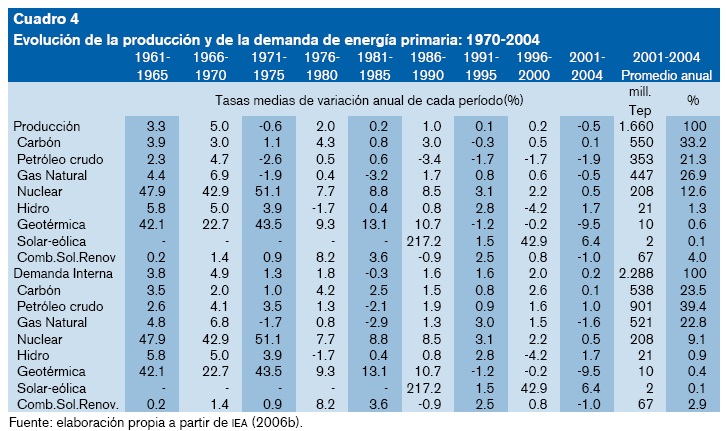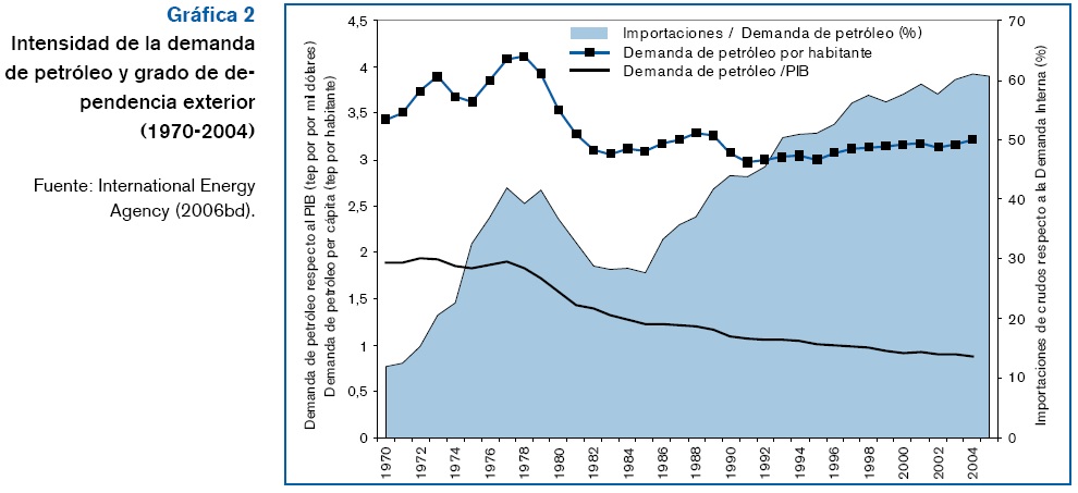 La demanda total de energía primaria (DTEP) creció de forma moderada durante las tres últimas décadas del siglo XX y se mantiene lenta aún más en los primeros años de la presente década (cuadro 1). La elasticidad DTEP-PIB, como relación entre los crecimientos de ambas variables entre 1970 y 2004 registra un valor de 0.26, de manera que en ese intervalo de tiempo la demanda de energía se ha incrementaron 50% mientras el PIB casi se ha triplicado. 2