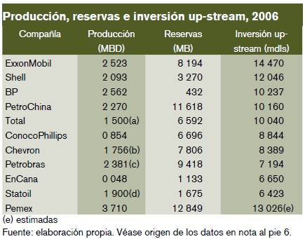 También pueden compararse los gastos de capital en los segmentos corriente arriba (up-stream) de la industria petrolera, que incluyen exploración, desarrollo y producción. Los cuadros de Energy Intelligence Research listan, para 2006, a las diez empresas que realizaron las inversiones más altas. Se advierte que "ocho de las diez compañías con mayor gasto de capital up-stream son privadas o, como es el caso de la brasileña Petrobrás, tienen capital privado mayoritario (68%). Sólo PetroChina y Statoil,14 entre las compañías nacionales de petróleo, se cuentan entre los líderes mundiales en materia de capex up-stream"(inversión en exploración y producción).15