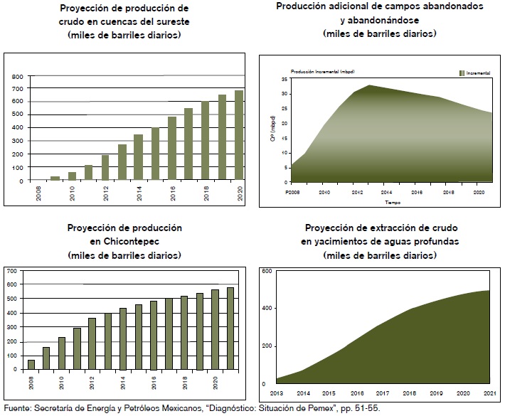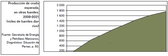 Se plantea conseguir entre 2008 y 2021 una producción incremental de hasta 1.8 mbd, que debería provenir de: