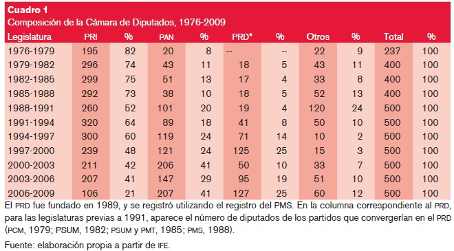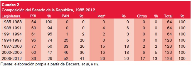 Para evidenciar cómo esas reformas electorales tuvieron repercusiones en los espacios clave de la vida política de México, los cuadros 1 y 2 ofrecen la composición de las dos Cámaras del Congreso de la Unión desde fines de los setenta a la actualidad. La ampliación gradual de la presencia de la oposición, primero en la Cámara de Diputados, inyectó pluralidad en el Poder Legislativo y terminó por generar hechos inéditos durante décadas: la pérdida, primero, de la capacidad del Presidente de la República y su partido, el Revolucionario Institucional (PRI), para modificar por sí mismos la Constitución (1985); más adelante, y hasta nuestros días, la desaparición de la mayoría del partido en el gobierno dentro de la Cámara de Diputados (1997), por lo que toda ley, incluyendo cada año la aprobación del presupuesto de egresos de la federación, tiene que ser consensuada con al menos uno de los dos grandes partidos de la oposición -en un primer momento el Partido Acción Nacional (PAN) y el Partido de la Revolución Democrática (PRD); luego del año 2000 el PRI y el prd-, lo que significa una erosión del presidencialismo mexicano, y más tarde (2000), el presidente perdería también la mayoría en el Senado. En los hechos, la mejoría en la representatividad de la diversidad política en el Congreso significó que el diseño de división de poderes establecido en la Constitución fuera efectivo.