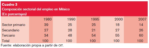 En términos generales, entre 1980 y 2007 el número de ocupados en México, de acuerdo a estimaciones propias a partir de datos de la Organización Internacional del Trabajo (OIT), creció en 175%, pero una visión desagregada por sectores evidencia que los ocupados en actividades primarias disminuyeron 2%; que la ampliación del empleo en el sector secundario fue menor a la media, al registrar 166%, mientras que los trabajadores en el sector servicios acumularon un incremento de 385 por ciento.
