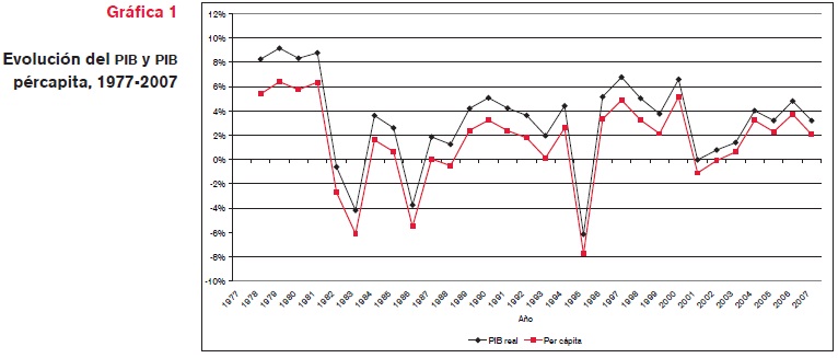 A lo largo de los últimos treinta años -que coinciden con el inicio de la democratización- la economía mexicana ha pasado por tres etapas diferentes (López, J. et al, 2008). En la primera, entre 1977 y 1982, el Estado jugó un papel de locomotora del crecimiento económico, apoyado en los altos precios internacionales del petróleo y la facilidad del endeudamiento externo. La segunda etapa inicia en 1983; de ese año a 1987, la economía permaneció estancada, con un errático crecimiento, que tuvo su mayor caída en 1986. En esta segunda etapa se introducen profundas reformas estructurales en la economía, perfiladas en la estrategia que luego se conocería como el "consenso de Washington": se dio marcha atrás a la protección de los productores domésticos, al impulso de la expansión del mercado interno y a la intervención gubernamental, dando paso a la apertura a las importaciones, al énfasis a la producción para el mercado externo y redefiniendo el papel del Estado en la economía. La tercera etapa, en la que aún nos encontramos, inicia en 1988 y está caracterizada por la consolidación del nuevo modelo de desarrollo; dentro de esta tercera etapa se pueden identificar dos subperiodos, que tienen su división en 1994, año en que entra en vigencia el Tratado de Libre Comercio con Estados Unidos y Canadá, que ha modificado el patrón de desenvolvimiento de la economía mexicana, y de la crisis que fue bautizada como "efecto tequila". (gráfica 1).