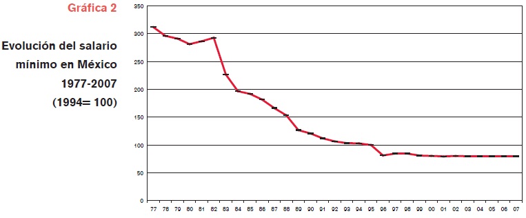 La ampliación de la oferta de trabajo en un largo periodo de atonía de la demanda laboral, ha tenido como efecto una caída en las remuneraciones al trabajo, además de una expansión de la heterogeneidad salarial, con su correlato sobre la distribución del ingreso en el país, que permanece como una de las más inequitativas del mundo. Por ejemplo, los salarios en la maquila (que pasó de representar 8.9% del empleo manufacturero en 1985 a 28% en 2003) son 40% más bajos que los salarios medios en la manufactura (López, et al, 2008). Por su parte, el salario mínimo real de 2007 representó apenas una cuarta parte del valor que alcanzó en 1977 (vease gráfica 2). En la actualidad, 5.3 millones de personas perciben un salario mínimo; 54% del total de los trabajadores mexicanos gana hasta 3 salarios mínimos y 75% hasta cinco minisalarios. Sólo 25% de la población ocupada gana arriba de 250 pesos diarios, uno de cada cuatro trabajadores mexicanos tiene ingresos que se acercan o superan los 20 dólares al día.