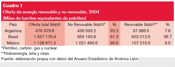 En México, sólo 9.5% de la oferta total de energía es renovable, mientras que en Brasil 38.7% de su energía es de fuentes renovables (Ver cuadro 1). Además, habría que aclarar que la poca energía renovable que se produce en México, a diferencia de Brasil, es fundamentalmente hidráulica, solar y eólica, y no se utilizan hasta el momento la producción comercial de biocombustibles a partir de cultivos agrícolas o forestales.