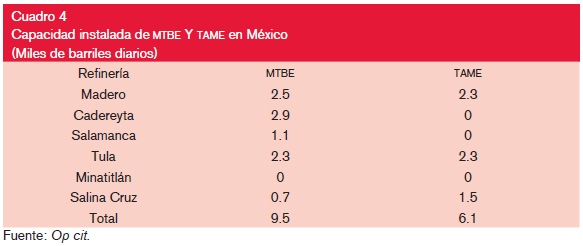 La cantidad de MTBE y TAME que se produjo en el 2005 fue de 6.6 y 4.2 millones de barriles diarios (total 10.8 MBD), no obstante que la capacidad instalada de 6 diferentes refinerías de Pemex son 15.6 MBD, como se observa en el cuadro 4.