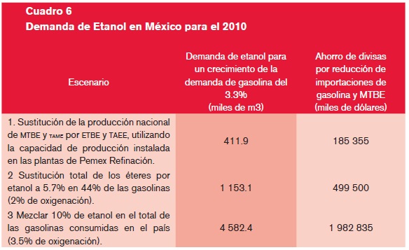 Bajo una serie de supuestos, entre los que destaca una tasa de crecimiento en el consumo de gasolina de 3%, una oxigenación de la misma de 2% en peso y tomando los valores para el 2005 (producción nacional e importado de oxigenantes, proporciones de MTBE de 11% y ETBE de 12.5% en las gasolinas), el estudio determinó la demanda potencial de etanol para cada uno de los escenarios descritos, para el año 2010 (ver cuadro 6).