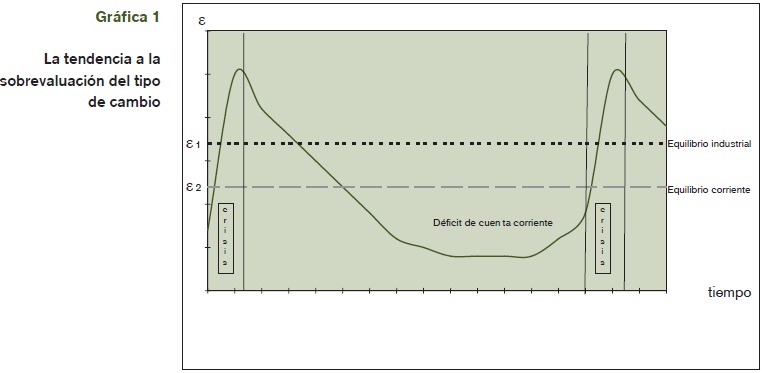 La tendencia a la sobrevaluación del tipo de cambio puede ilustrarse con una simple gráfica. En la gráfica 1, el tipo de cambio está definido como el precio en moneda local de una moneda extranjera o de una canasta de monedas,6 de manera que cuanto más baja sea la curva cambiaria, más se apreciarán la moneda local o el tipo de cambio. Si tomamos como punto de partida una crisis financiera y la rápida y fuerte depreciación de la moneda local respectiva (un incremento casi vertical del tipo de cambio de la gráfica), sobrevendrá un proceso gradual de apreciación del tipo de cambio, impulsado por los distintos factores o causas recientemente analizados. Durante el proceso de sobrevaluación, el tipo de cambio, bajo la presión del mal holandés, cruza primero la línea horizontal que representa el tipo de cambio de equilibrio industrial (e1), continúa apreciándose (es decir, cayendo en la gráfica), y cruza la línea horizontal representativa del tipo de cambio de equilibrio corriente (e2). A partir de este punto, el mal holandés de empujar hacia abajo el tipo de cambio, pero su apreciación continúa y el país ingresa en la zona de déficit de cuenta corriente bajo la presión de la política de crecimiento con ahorro externo y del populismo cambiario. Por último, a medida que el déficit crece y erosiona la confianza de los acreedores internacionales, se materializa la crisis de la balanza de pagos, y el tipo de cambio vuelve a depreciarse verticalmente. ¿Cuánto tiempo dura todo este ciclo? Si el país no cuenta con una política de neutralización de la tendencia a la sobrevaluación del tipo de cambio, el lapso entre crisis puede ser breve (digamos ocho años). La presunción de que un régimen de flotación cambiaria corregirá automáticamente el tipo de cambio no es realista, ya que los flujos de capital, y no los del comercio, son hoy los principales factores determinantes del tipo de cambio de mercado. Mientras los inversores extranjeros conserven la confianza y se sientan atraídos por altas tasas de beneficio y de interés, continuarán financiando al país. En determinado momento, sin embargo, percibirán el riesgo y el efecto gregario llevará al país hacia el default. No obstante, en la medida que el país pueda neutralizar parcialmente la tendencia a la sobrevaluación del tipo de cambio, la crisis podrá evitarse sólo se observarán tasas de crecimiento más bajas.