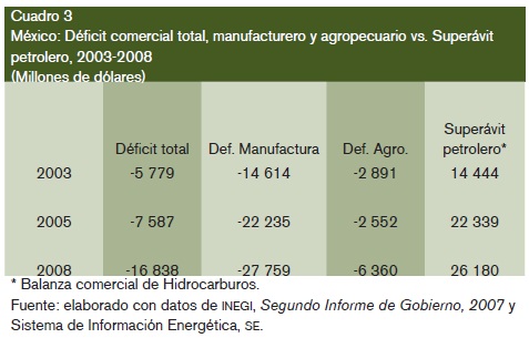 La liberalización económica y la política macroeconómica de estabilidad han ocasionado que todo incremento de demanda propiciado por la entrada de capitales repercuta en incremento de importaciones y en déficit de comercio externo (véase cuadro 3), filtrándose así al exterior dicha entrada de recursos, lo que impide que impulse un mayor dinamismo en la economía y en el empleo. Ello explica, el porque la economía mexicana, no obstante la entrada de capitales y el boom petrólero del período 2003 al 2008, no alcanzó condiciones de crecimiento sostenido, sino que pasó a crecer en la presente década por debajo de la media de los países de América Latina y de los países exportadores de petróleo.
