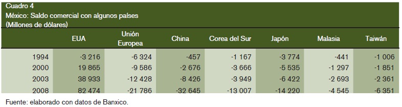 Ante los bajos niveles de productividad de la producción nacional, se recurre a importaciones para abaratar costos e incrementar exportaciones, por lo que la dinámica de éstas no se irradia al conjunto de la economía. Asimismo, la IED ligada a las exportaciones manufactureras, trae su tecnología, su equipo e insumos, por lo que su dinámica no se trasmite al resto de la industria nacional. 75% de las exportaciones manufactureras pertenece a exportaciones de maquila, las cuales se caracterizan por tener un valor agregado nacional de 5% de su valor total. México no puede competir con bajos salarios, pues siempre habrá otro país que los tenga menores. Con Estados Unidos se tiene superávit de comercio exterior, debido al petróleo y a las exportaciones de maquila, las cuales tienen un alto coeficiente importado, generado por insumos provenientes de China y del resto de Asia, por lo que se tiene déficit con éstos y con Europa (véase cuadro 4).