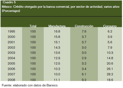 La liberalización económica y la política macroeconómica de estabilidad, más que contribuir a la estabilidad y operatividad del sector bancario a favor del crecimiento, han llevado a que sea disfuncional, dado que se otorgan más créditos al consumo que a la industria manufacturera (véase cuadro 5).