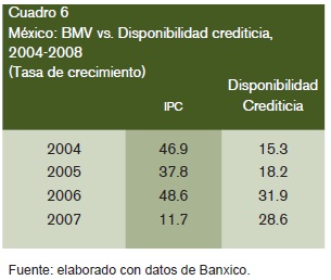Cabe destacar que parte significativa de los créditos, se canalizaban a la esfera financiera especulativa, dada la asociación mostrada entre el aumento de la disponibilidad crediticia y el boom de la BMV en dicho período (véase cuadro 6). Al aumentar la BMV, se incrementa la disponibilidad crediticia de los tenedores de acciones, en razón de su mayor capacidad de pago, lo que contribuía a potenciar las ganancias bursátiles. Éstas se explican por los capitales que fluyen a dicho mercado, sea por los fondos de pensión, por la privatización de empresas, por la entrada de capitales del exterior, por los flujos crediticios que ahí se destinan, por la búsqueda de oportunidades de inversión más atractivas, por las relativas bajas tasas de interés que incentivan la inversión en el mercado de capitales, así como por el contexto de estabilidad monetaria-cambiaria que incentiva asumir posiciones de riesgo. Ello contribuye a incrementar la demanda de acciones, lo que aumenta su precio, haciendo que éste sector se distancie del resto de los sectores de la economía.