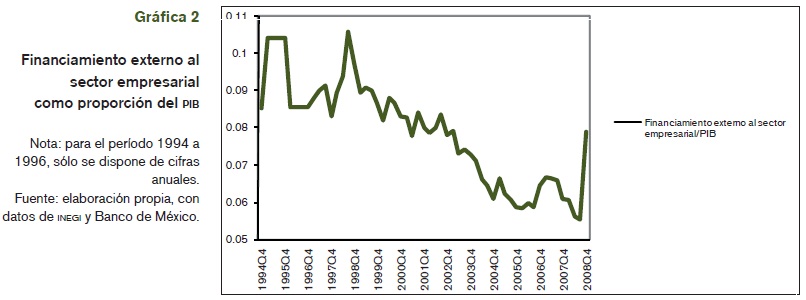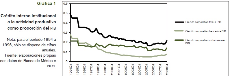 Durante los últimos 14 años, México ha experimentado una contracción del crédito institucional con relación al PIB que ha afectado principalmente a la actividad productiva. El crédito bancario a empresas y personas físicas con actividad empresarial bajó de 28 a 7% del PIB entre 1995 y 2008, y el proveniente de otros intermediarios financieros, como Sofoles, empresas de factoraje, arrendadoras financieras, lo hizo de 21 a 14% del PIB. (ver gráfica 1).