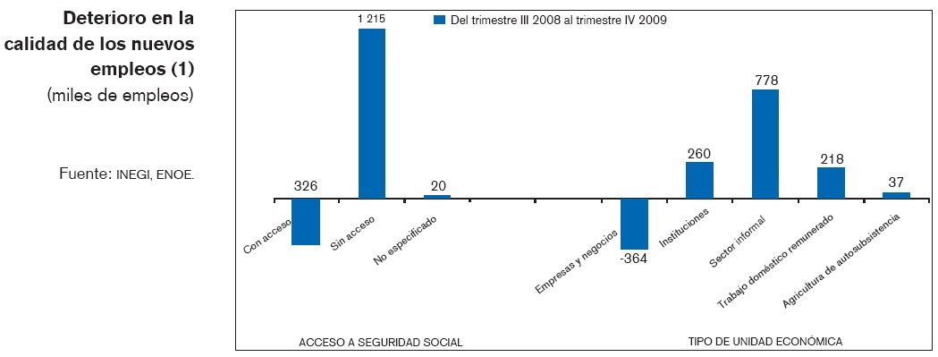Por cuanto al acceso a la seguridad social, se puede apreciar que ha habido un retroceso importante en la calidad de los empleos. Mientras que las ocupaciones con acceso a cualquiera de los sistemas de seguridad social disminuyeron en 326 mil personas entre el tercer trimestre de 2008 y el cuarto de 2009, el grueso de las ocupaciones diversas que se generaron en este lapso, carecen de todo tipo de seguridad social. Es decir, es empleo precario.