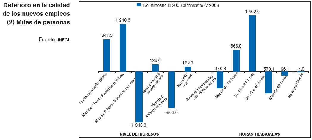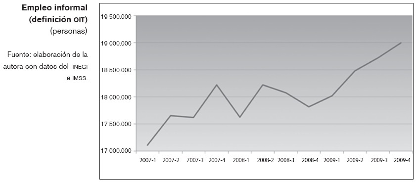 En la gráfica siguiente se muestra que de octubre de 2008 hasta diciembre de 2009 la nueva fuerza de trabajo tuvo que encontrar otros caminos. Por una parte, recurrió al llamado empleo "informal", constituido por trabajo precario, sin acceso a prestaciones laborales o seguridad social. Sus manifestaciones de aprecian en múltiples modalidades, desde la venta en puestos fijos y semifijos, servicios rudimentarios como aseo de calzado, limpieza de autos, distribución de mercancías en la vía pública, pequeños negocios o puestos de comida, o de manera creciente, mediante trabajo asalariado al margen de las prestaciones de ley y de los servicios de seguridad social. Estos trabajos carecen de estabilidad y se prestan en múltiples ocasiones en jornadas más reducidas que las que el trabajador estaría dispuesto a laborar. En el lapso de referencia este tipo de ocupaciones se incrementaron en poco más de 900 mil personas.