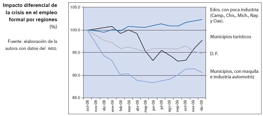 Una manera de apreciar el impacto diferencial de la crisis en el empleo es seleccionando grupos de municipios y entidades federativas que presentan muy distintas características entre sí y siguiendo el comportamiento que ha tenido el empleo formal en ellas en los 14 meses transcurridos de octubre de 2008 a diciembre de 2009. En la gráfica siguiente se muestra el comportamiento diferencial de 4 grupos distintos de municipios o entidades federativas: