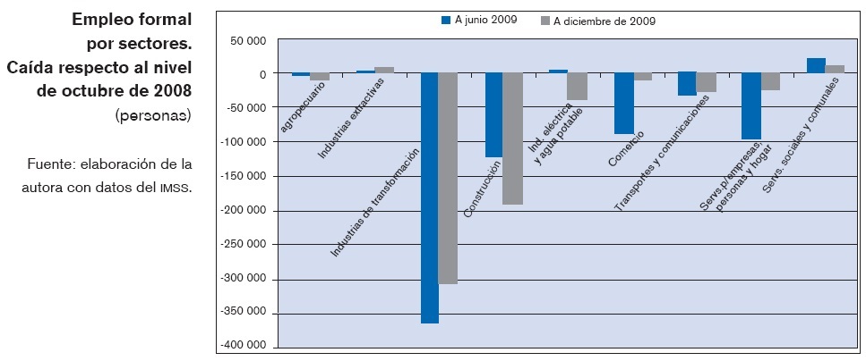 Durante el lapso transcurrido desde que se inició la crisis, sólo dos sectores se han salvado de la caída en el empleo, si bien su incremento en este lapso ha sido meramente marginal. Se trata de las industrias extractivas y del sector de servicios sociales y comunales, que engloba instituciones educativas, de salud, de seguridad social, así como agrupaciones sindicales, o de organismos internacionales. En todos los demás, sin excepción, ha habido un desplome significativo de su plantilla laboral. La caída más importante se concentra en dos sectores: el de la industria de transformación, que ha sufrido el golpe directo de la recesión y el sector de la construcción que ha frenado su actividad de golpe. Otros sectores, como el comercio y los servicios a empresas y personas, que incluye los servicios financieros, de seguros, inmuebles, de hotelería, restaurantes y recreativos han seguido a los demás en la caída, aunque con menor intensidad.