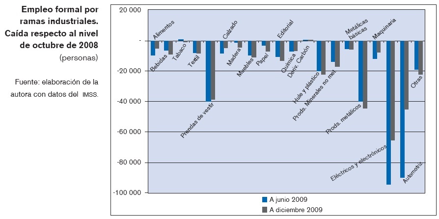 Le siguieron en importancia la pérdida de empleos en la producción de productos metálicos y en la industria del vestido, también vinculadas en su mayor parte al mercado externo. El resto de las ramas industriales, de las 20 que registra el IMSS, sufrieron todas pérdidas importantes de puestos de trabajo desde que se inició la recesión hasta mediados de 2009.
