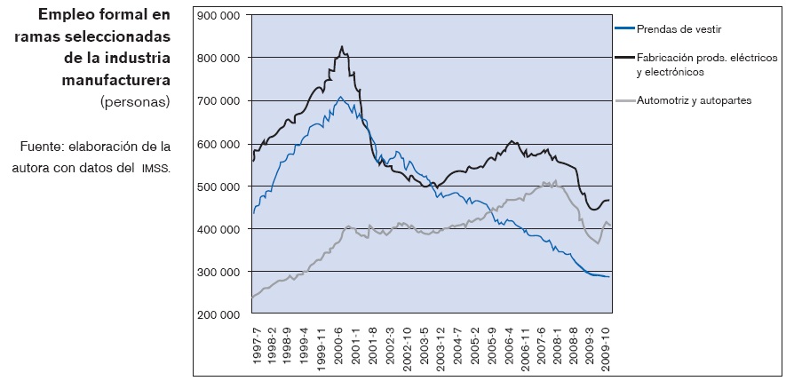 En efecto, las industrias maquiladoras de productos electrónicos y prendas de vestir, que fueron las que impulsaron el crecimiento después de la crisis de 1995, resultaron las más afectadas tanto por la recesión de 2001 en Estados Unidos, como por la entrada de la competencia China y de nuevos países maquiladores. En particular, la industria de prendas de vestir ha experimentado una pronunciada caída en su empleo desde fines del año 2000 y a juzgar por las cifras, podría estar en vías de desaparición. La industria de producción de artículos eléctricos y electrónicos logró frenar su caída en el 2003. Sin embargo, ambas ramas han reducido su plantilla en más de 727 000 personas en los últimos ocho años.