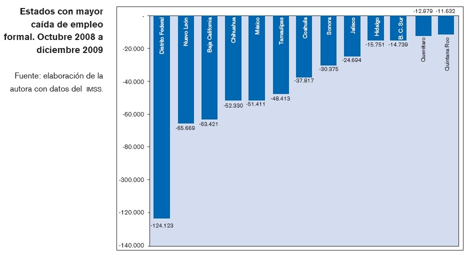 La situación del D. F es singular, ya que "a diferencia de la mayoría de los estados" en esta entidad se profundizó en mayor medida el descenso en el empleo formal en el segundo semestre de 2009. Otras entidades que acentuaron la pérdida de empleos en el segundo semestre de 2009 fueron Baja California, Baja California Sur, Hidalgo, Estado de México, Quintana Roo y Tlaxcala. Este último destaca como uno de los de mayor pérdida porcentual de empleos.