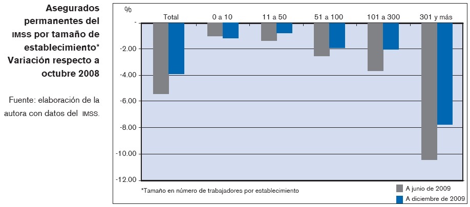Los establecimientos más afectados por la crisis han sido los de mayor dimensión. De octubre de 2008 a diciembre de 2009, que fue el período de caída más intensa del empleo, aproximadamente 7.4% de los establecimientos productivos registrados en el IMSS con más de 300 trabajadores, que se encuentran entre los vinculados con el sector exportador, habían cerrado sus actividades. Los mejor librados habían sido los establecimientos más pequeños, ya que entre los de 1 a 10 trabajadores la disminución en su número ligeramente sobrepasaba 1%. Es decir, la crisis significó un cambio importante en la composición cualitativa de los establecimientos productivos, aumentando el peso relativo de los más pequeños y de los que lindan con la informalidad.